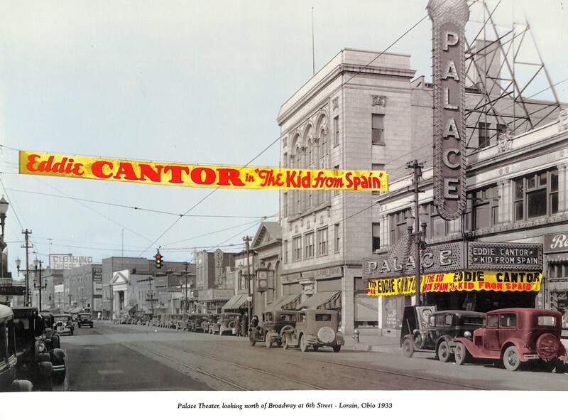 A colorized photograph of the Lorain Palace Theater on Broadway Avenue in Lorain, Ohio, c. 1933. There is a banner and a marquee message announcing "Eddie Cantor in The Kid from Spain." Photographer is unknown.