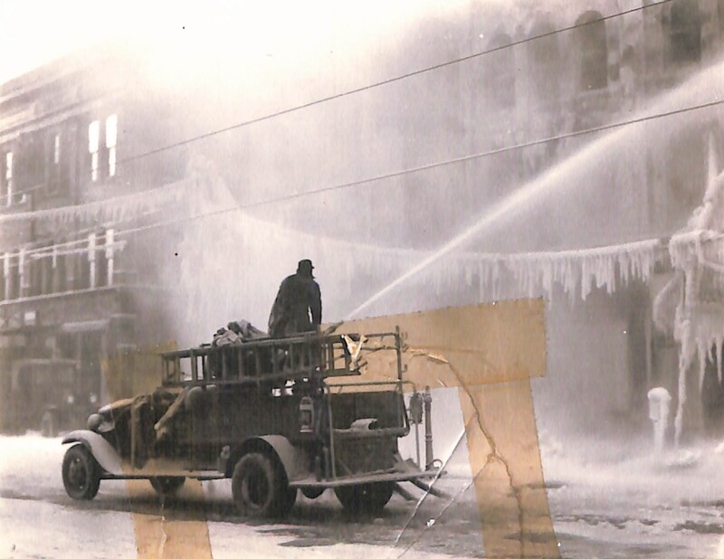 Lorain Fire Department members fighting a fire at the Hotel Lorain in Lorain, Ohio on February 18, 1936. The hotel was located at the corner of West 7th Street and Broadway Avenue. The fire destroyed the hotel building.