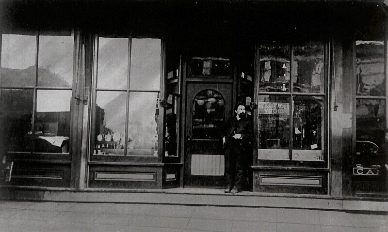 Hans Peder Nielsen standing in front of H.P. Nielsen Jewelers, Lorain, Ohio