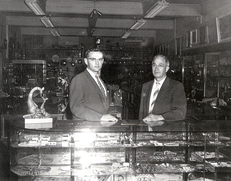 Carl Nielsen, Sr. and Walter Nielsen behind the jewelry counter of Nielsen Jewelers, Lorain, Ohio