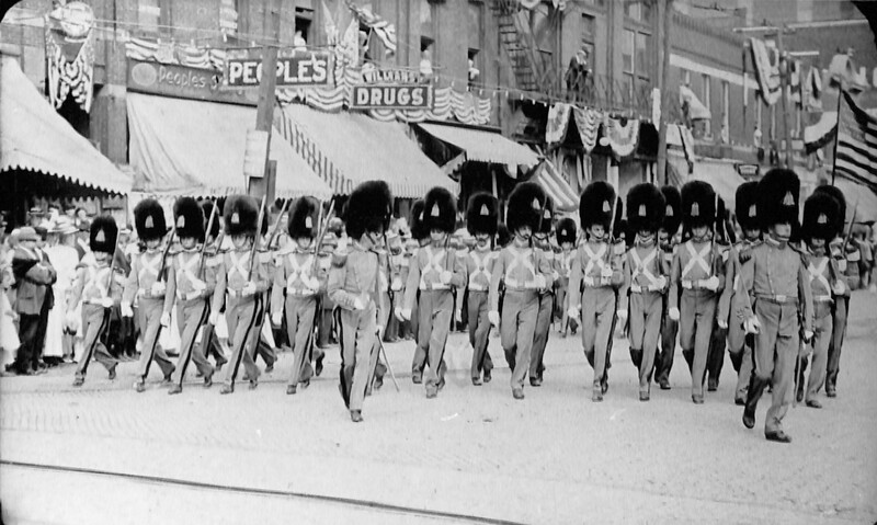 A uniformed unit of men wearing tall bearskin caps marches on Broadway Avenue in Lorain, Ohio. The parade or event the unit is marching in is not known, nor is the exact date.
