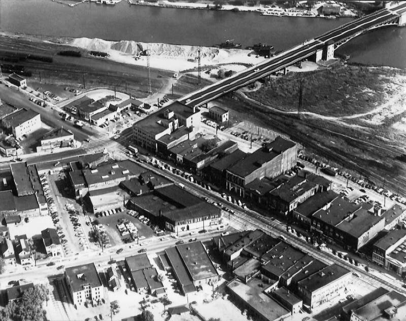 An aerial view of Lorain, Ohio looking northeast from Fifth Street to the Black River and the bascule bridge. The Baltimore and Ohio (B&O) railroad tracks are also visible behind the east side of Broadway Avenue in the right center of the photograph. The B&O coal docks are also visible in the top and left center of the photograph, west of the river.