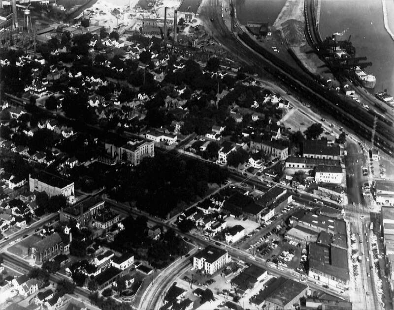 Landmarks visible in the photograph include the Antlers Hotel (center left in the photograph) and the Edgewater Power Plant near the railroad tracks near the top center of the photograph. Also visible are the First Congregational Church in the left of the photograph, as well as the Disciples of Christ Church.