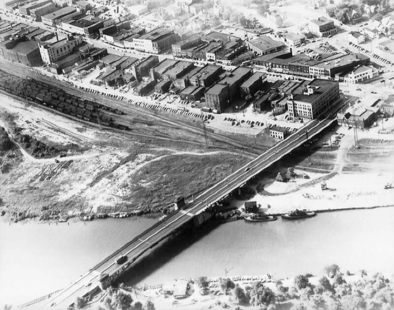 Visible in the photo are the Black River, the northern section of Broadway Avenue and the Baltimore and Ohio Railroad tracks. Two tugboats are docked on the east side of the Black River, close to the bridge underpass.