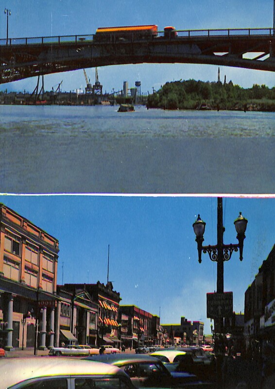Two photographs mounted on the same paper showing the Bascule Bridge across the Black River and a photo of part of the east side of Broadway avenue north of the 600 block of Broadway avenue.
