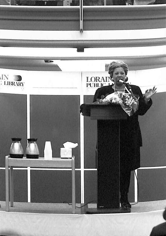 Toni Morrison acknowledging the audience attending the dedication of the reading room at the Lorain Public Library Main branch, January 22, 1995. Photograph by Jim Kolaczko.