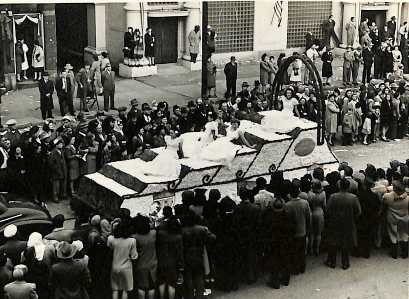 The second photograph is of a float in the shape of a boat cruiser. Several women, perhaps pageant entrants, are posed on top of the float and are waving to the crowd. One woman, at the top right of the float, is wearing a crown.