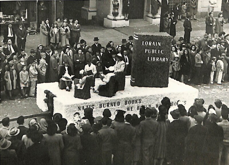 The third photograph is the Lorain Public Library float. Several women dressed in what was then considered "librarian" attire are seated on the left of the float in individual chairs reading books. One woman in the center of the float appears to be standing at a desk, perhaps ready to check out books. "Lorain Public Library" is printed on the cover of the giant book on the back right of the float. Under the main area of the float are the words "Nazis Burn Books We Build Walls of Books."